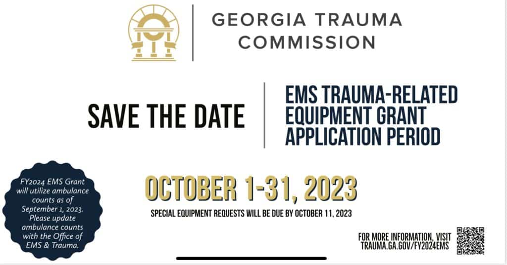 At the request of the EMS Committee, the Georgia Trauma Commission approved another grant award opportunity using FY 2024 funding for EMS agencies “GRANTEE” to be used for the purchase(s) of Trauma Related Equipment to equip 911-zone ambulances.