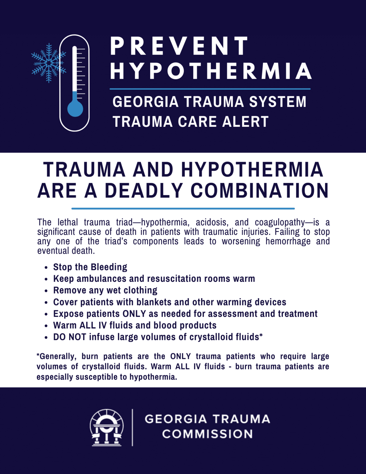 While Hypothermia and Trauma are always a deadly combination, we would ask that all trauma care providers be more mindful of hypothermia prevention as temperatures drop dangerously low over the season. Please share the with your EMS and Hospital partners.